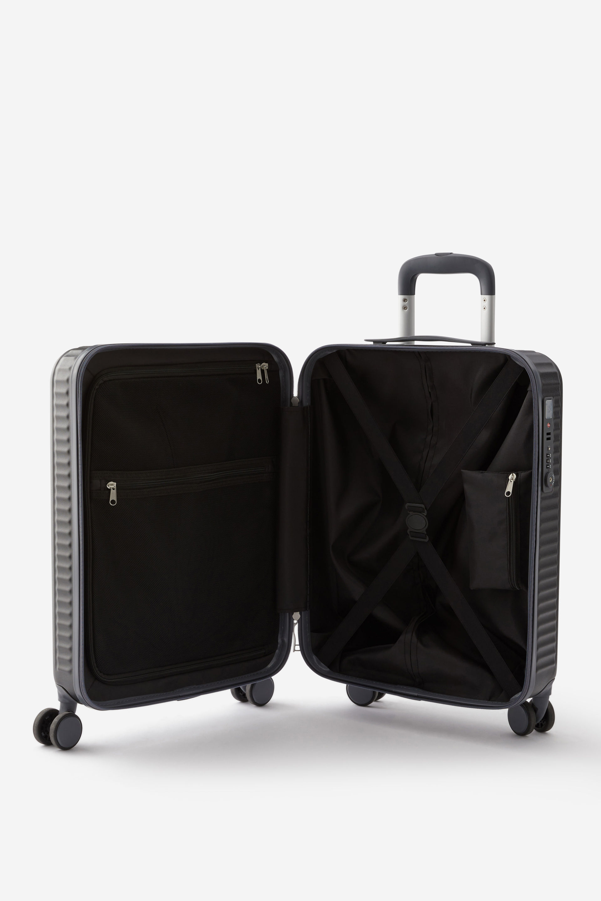 Travel light and organised with the Traveller 20 Inch Carry On Suitcase. Weighing only 2.8kg, it features a TSA lock, smooth 360 degree double wheels, and smart internal compartments to secure clothes. The USB charging port connects to your own portable power bank inside, giving you external access to charge your devices on the go.